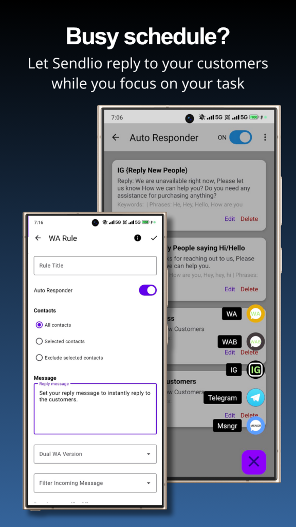Set custom auto-reply rules with keyword matching for incoming messages, and schedule WhatsApp Status updates automatically.