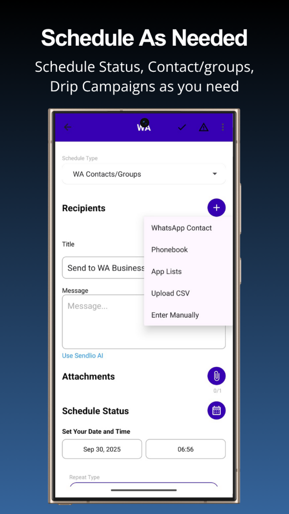 Easily choose contacts, upload a CSV, or target WhatsApp groups and broadcast lists in seconds.