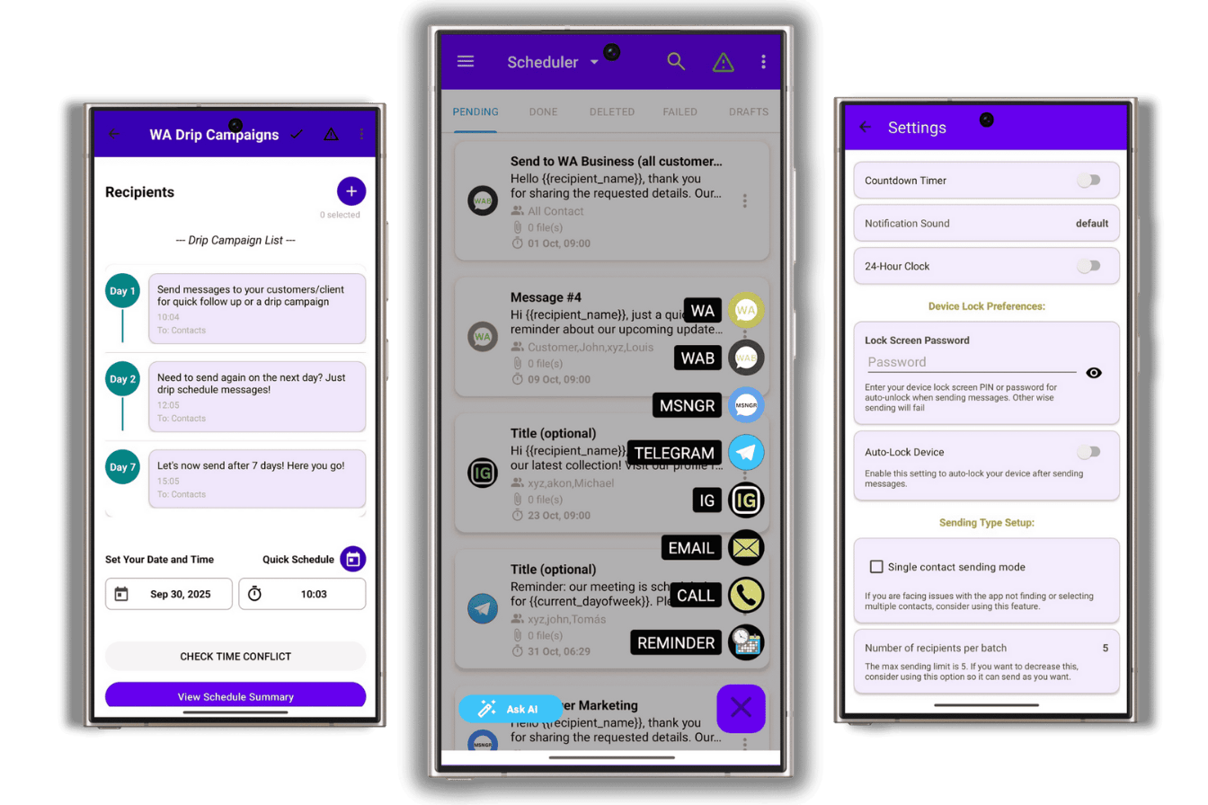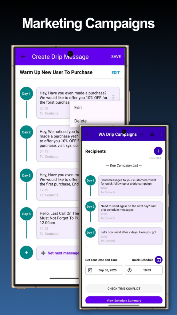 Plan ahead with drip campaigns that automatically send messages over days or weeks — perfect for marketing, nurturing leads, or ongoing engagement.