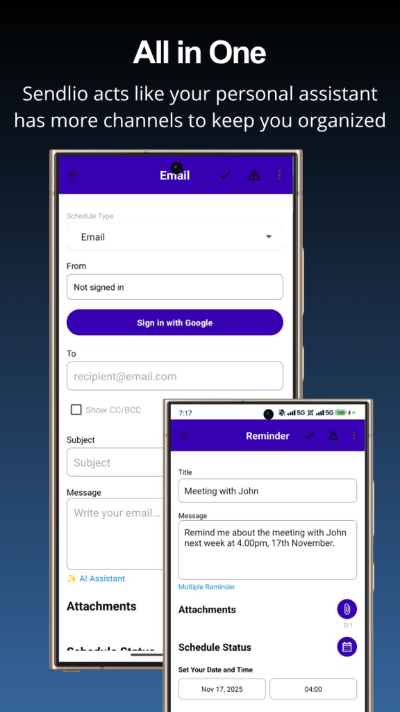Never miss a deadline, appointment, or special occasion. Sendlio lets you set personal and business reminders alongside your campaigns.